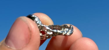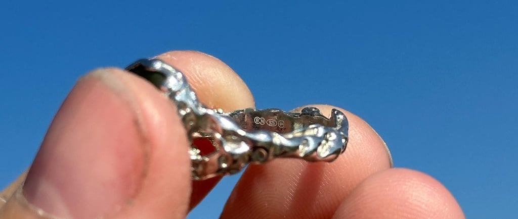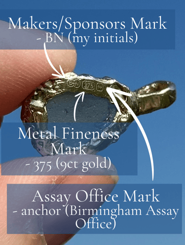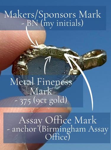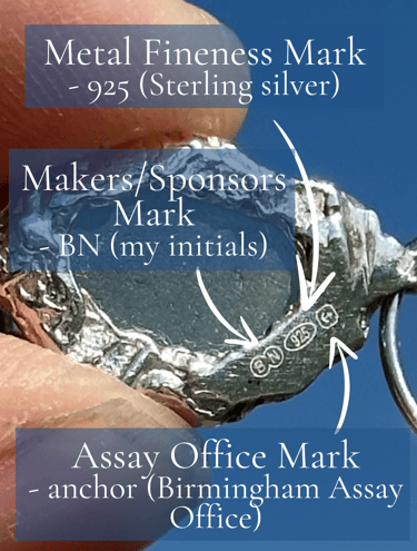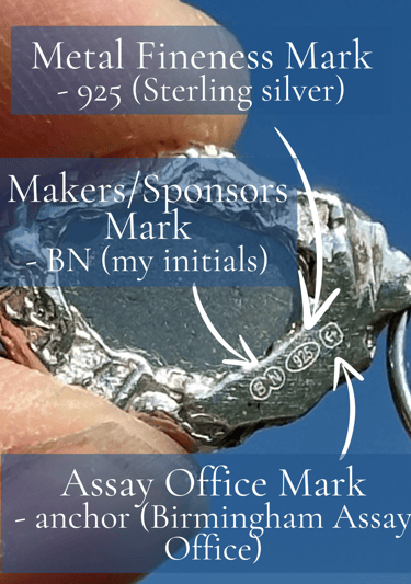Traditionally, hallmarks are stamped on, though new technology means that you can also use a laser to engrave instead. Because a lot of my pieces are made with sea glass, which could be damaged by the stamping process, I've opted for a laser hallmark.